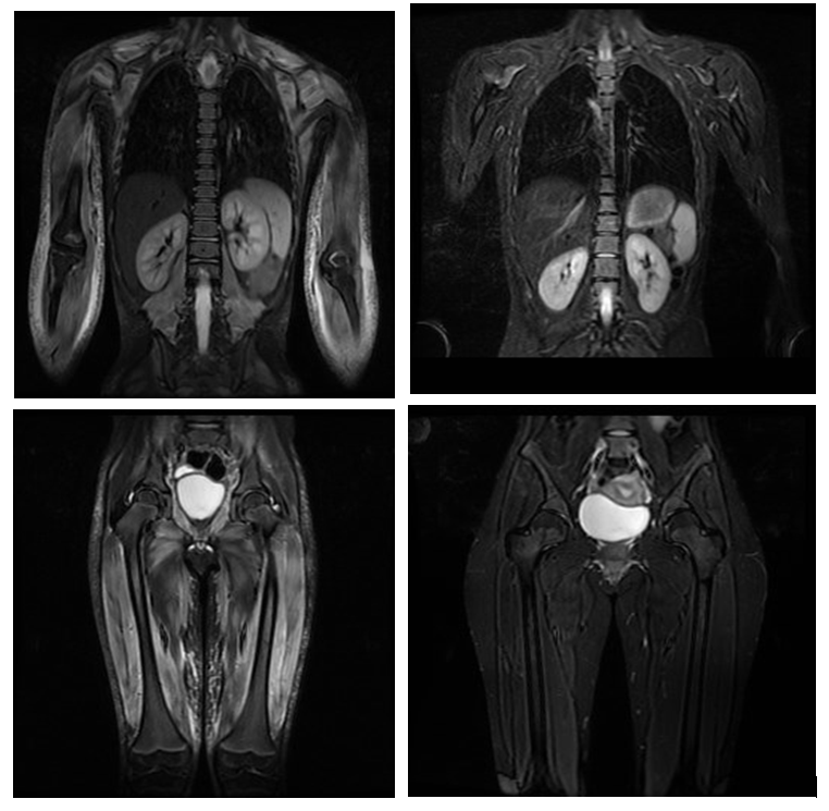 La resonancia magnética (RM) es una prueba de diagnóstico por la imagen que permite valorar de forma indirecta la presencia de inflamación muscular. Se realiza con el paciente tumbado precisando que el niño/a no se mueva durante el tiempo en el que se toman las imágenes. No radia, no precisa la administración de contraste, pero la duración habitual es de 30-45 minutos por lo que, en los casos de menor edad puede ser necesaria la sedación del paciente. Se puede realizar de una zona determinada del cuerpo o corporal total, permitiéndonos valorar la extensión de la inflamación. La resonancia ha permitido comprobar la afectación de músculos que inicialmente se creían respetados como la musculatura distal de extremidades (más alejada del tronco). Por ello, podemos afirmar que la DMJ es una miopatía de predominio pero no exclusiva proximal.