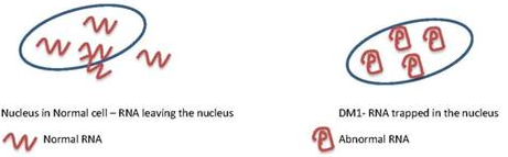 We do not have a full understanding of how the CTG repeats interfere with normal function. Recent scientific advances show that too many CTG repeats lead to an abnormal RNA. RNA’s are copies of the gene and they instruct the cells to make essential proteins. Too many CTG repeats in the DMPK gene affect the production of RNA. The RNA assume an unusual shape (see below); they then become trapped in the cell nucleus. Once trapped, they interfere with the function of other important proteins. These proteins are essential for different functions. This is likely why DM1 affects many different systems in the body.
